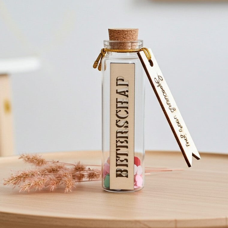 Een wensbuisje om een dierbare beterschap te wensen. Speciaal ontworpen om een glimlach te toveren op het gezicht van iemand die wel een opkikkertje kan gebruiken.