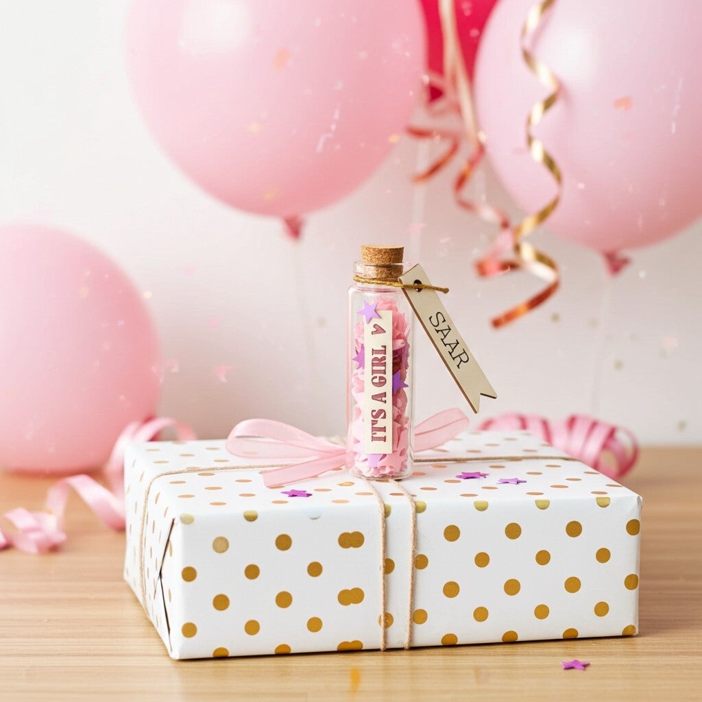 Het wensbuisje bevat een houten tag met de tekst It’s a boy of It’s a girl, gevuld met blauwe of roze confetti in de vorm van babyflesjes, sterretjes of speentjes. Op de voorkant van het houten label kun je de naam van de baby laten graveren in een duidelijk leesbaar lettertype. Op de achterkant is ruimte voor je eigen naam of een korte persoonlijke boodschap.