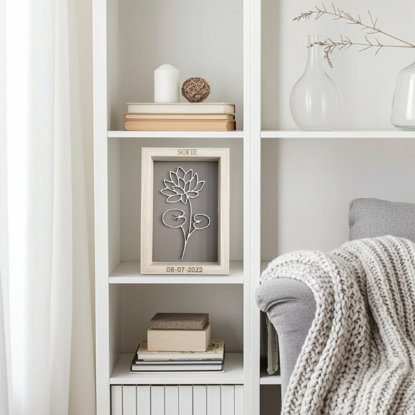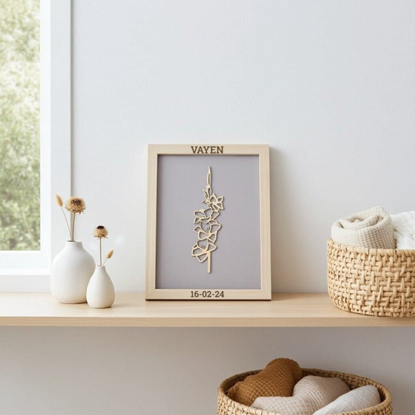 Een ingelijste geboortebloem geeft het interieur een warm en persoonlijk accent en staat prachtig op een plank, kastje of vensterbank, in de babykamer of woonkamer.