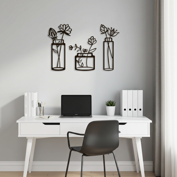 Wanddecoratie hout bloemen in vaas | Set van 3 | #1