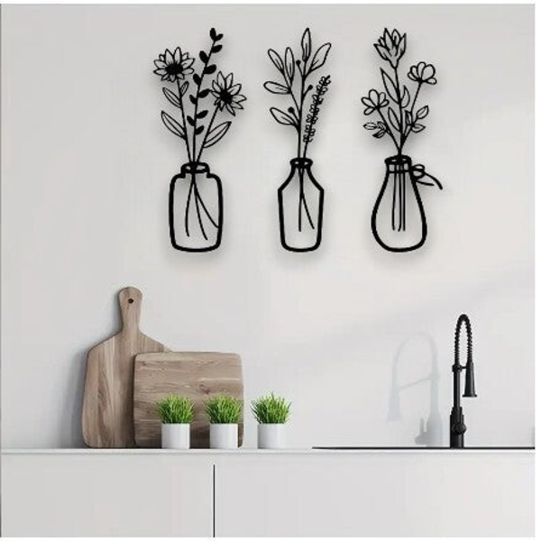 Wanddecoratie hout bloemen in vaas | Set van 3 | #2