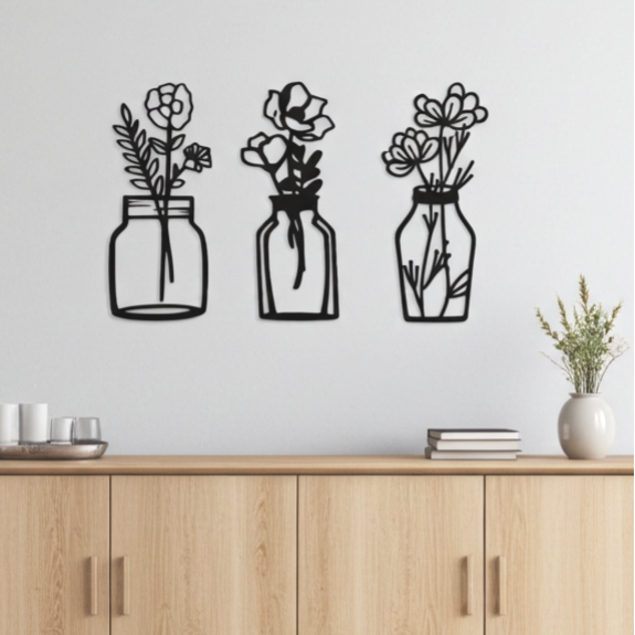 Wanddecoratie hout bloemen in vaas | Set van 3 | #3