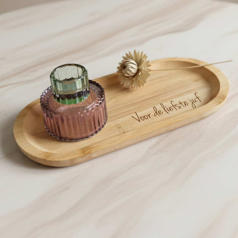 Dit gepersonaliseerde serveerplankje maakt elk koffie-of theemomentje van de juf of meester net even specialer. Praktisch in gebruik, maar door de naam, korte tekst en afbeelding ook een heel persoonlijk cadeau.