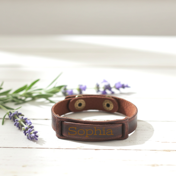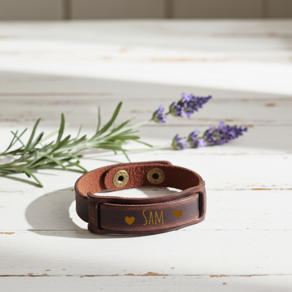 Een armband met naam doet het altijd goed! Deze armband van zacht, soepel leer draagt fijn en kan gegraveerd worden met een naam of korte tekst naar keuze.
