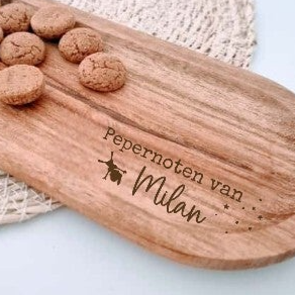 De gravering bepaal je zelf, bijvoorbeeld met de naam van je kind of een andere tekst zoals 'Lekkers van Kaya' of 'Snoepplankje van Sofia'. Zo wordt het een uniek serveerplankje dat elke Sinterklaasperiode weer opnieuw gebruikt kan worden.